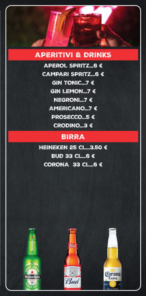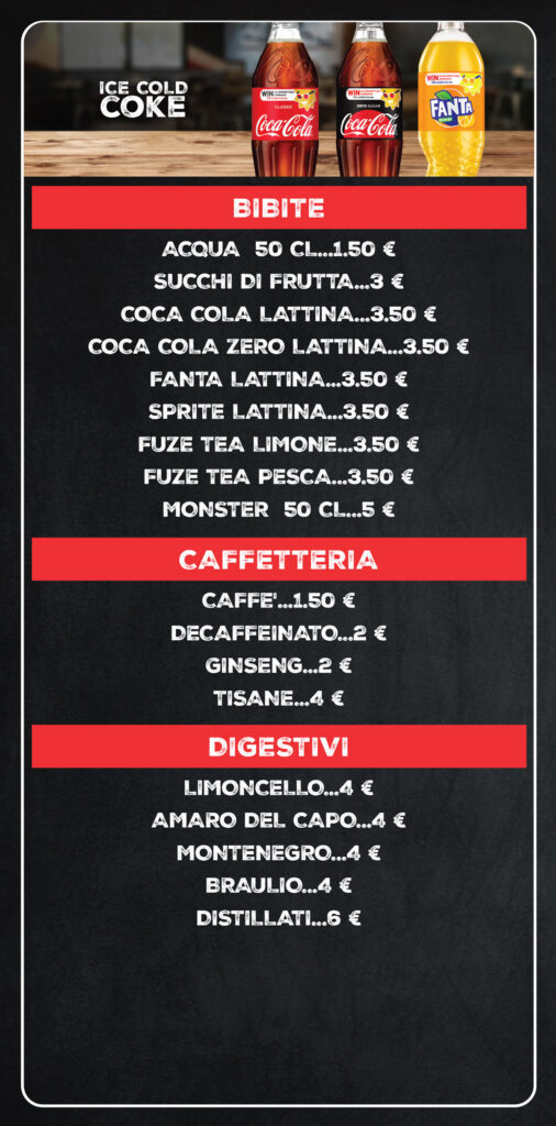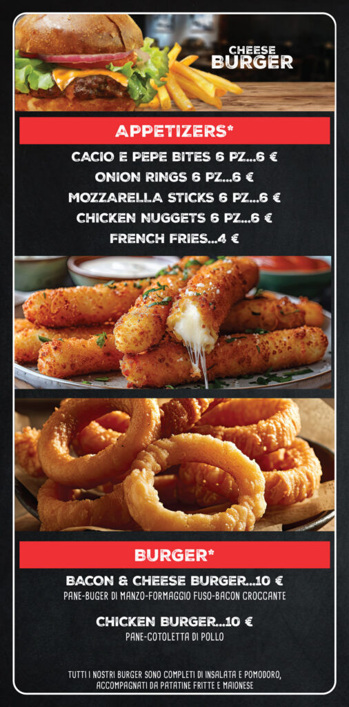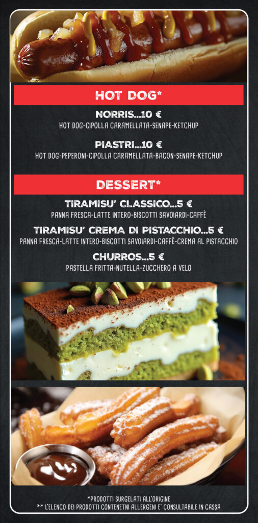 Il menù* offre una varietà di opzioni adatte a tutta la famiglia: da Burger a pinse, da alette di pollo appetitose a nachos con formaggio fuso e Jalapeno. Per dessert, offriamo anche degli squisiti Churros o un rinfrescante gelato.
